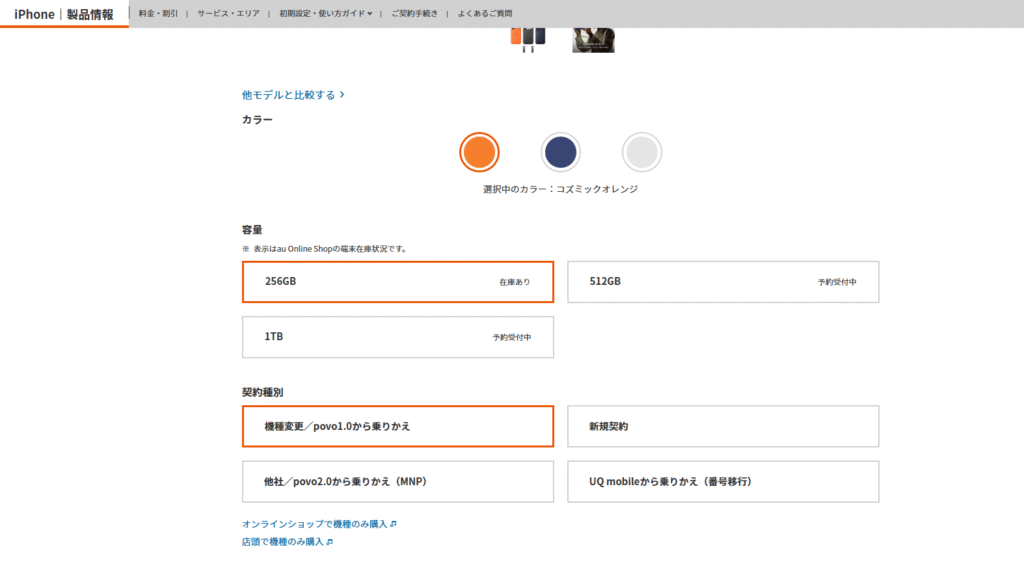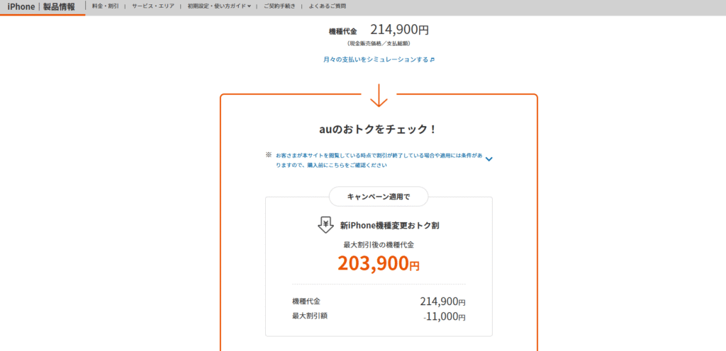 そしてこちらがauオンラインストアでのiPhone17Pro256GB ¥214,900(キャンペーン利用で¥203,900)